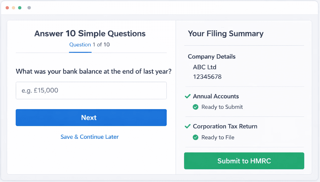 Instead of dealing with accounting software or hiring an accountant, you just answer a series of plain-English questions. We take your answers and generate everything you need and file directly with HMRC and Companies House.